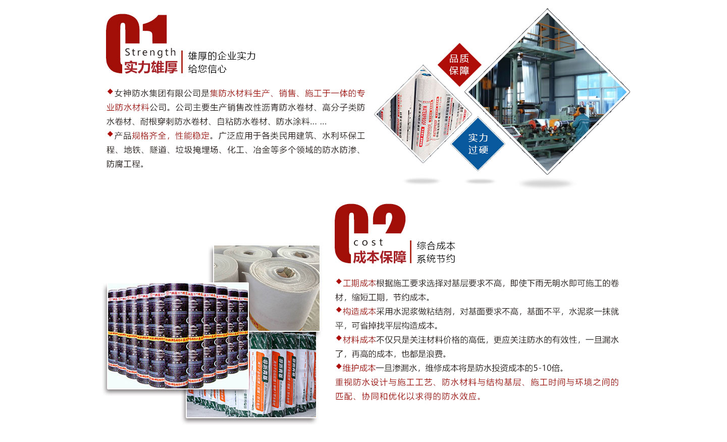 安徽女神建材科技集团有限公司是集防水材料研发、生产、销售、施工为一体的综合性防水材料集团公司。我公司旗下有多条大型一次成型生产线:SBS改性沥青防水卷材,DTM聚酯复合高分子防水卷材,非沥青基高分子防水卷材,PVC,TPO高分子防水卷材等生产线。我公司秉承“创新发展、实惠用户”为宗旨,确保生产材料基础上推出“共享生产厂家”,为开发商、建筑商节约成本为理念,新理念受到用户企业集采时一致好评和认可。在互联网时代,我公司将以互联网“共享”为发展理念,为开发商、建筑商、防水企业提供的产品,真正让用户企业达到巨大...